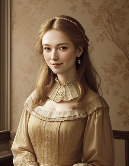 This image shows a woman's portrait in a vintage parlor, rendered as a detailed oil painting with soft, feathery brushstrokes and a warm color palette. Features Rembrandt lighting for a rich, inviting atmosphere.