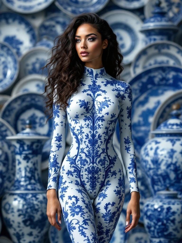 This image shows a woman in a Delft Blue porcelain-inspired catsuit. The suit features traditional Dutch floral patterns. She stands against a backdrop of oversized Delft Blue china, including vases and urns.