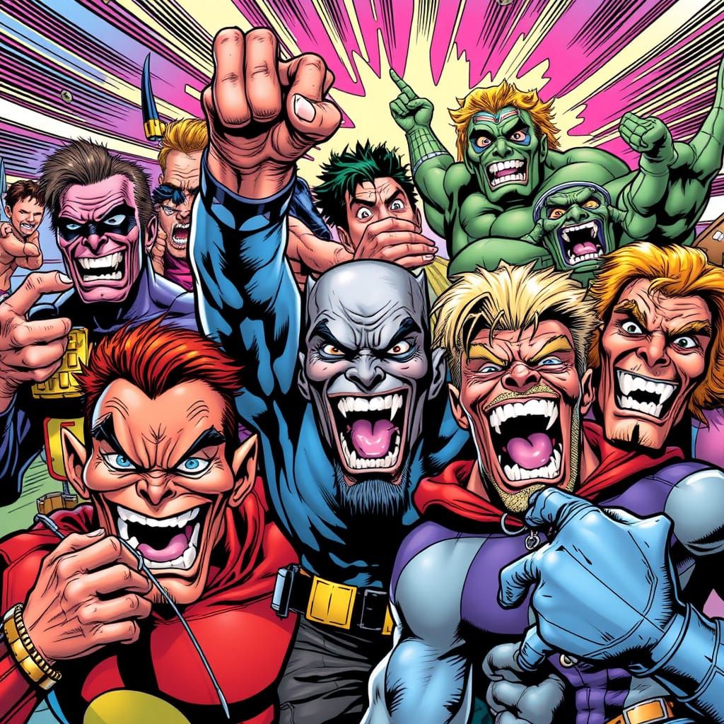 A dynamic comic book scene with colorful characters striking exaggerated poses. The image features bold lines, detailed textures, and graphic patterns in a vibrant, comic book aesthetic.