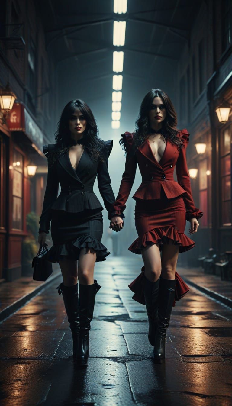 This image shows two figures in pinstripe skirt suits and black boots, holding hands. Voluminous hair and intricate details create a hyperrealistic and cinematic feel, with high contrast and atmospheric lighting.