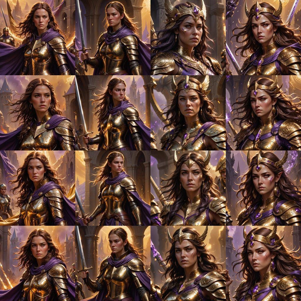 This image depicts Rebecca as a powerful goddess of war, adorned in regal bronze and purple attire with flowing brown hair.
