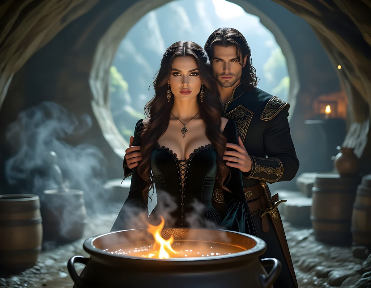 A close-up of a beautiful witch in a dark dress and a handsome prince behind her in a medieval cave with a bubbling cauldron. Ethereal fantasy, hyperdetailed, mist, natural lighting.