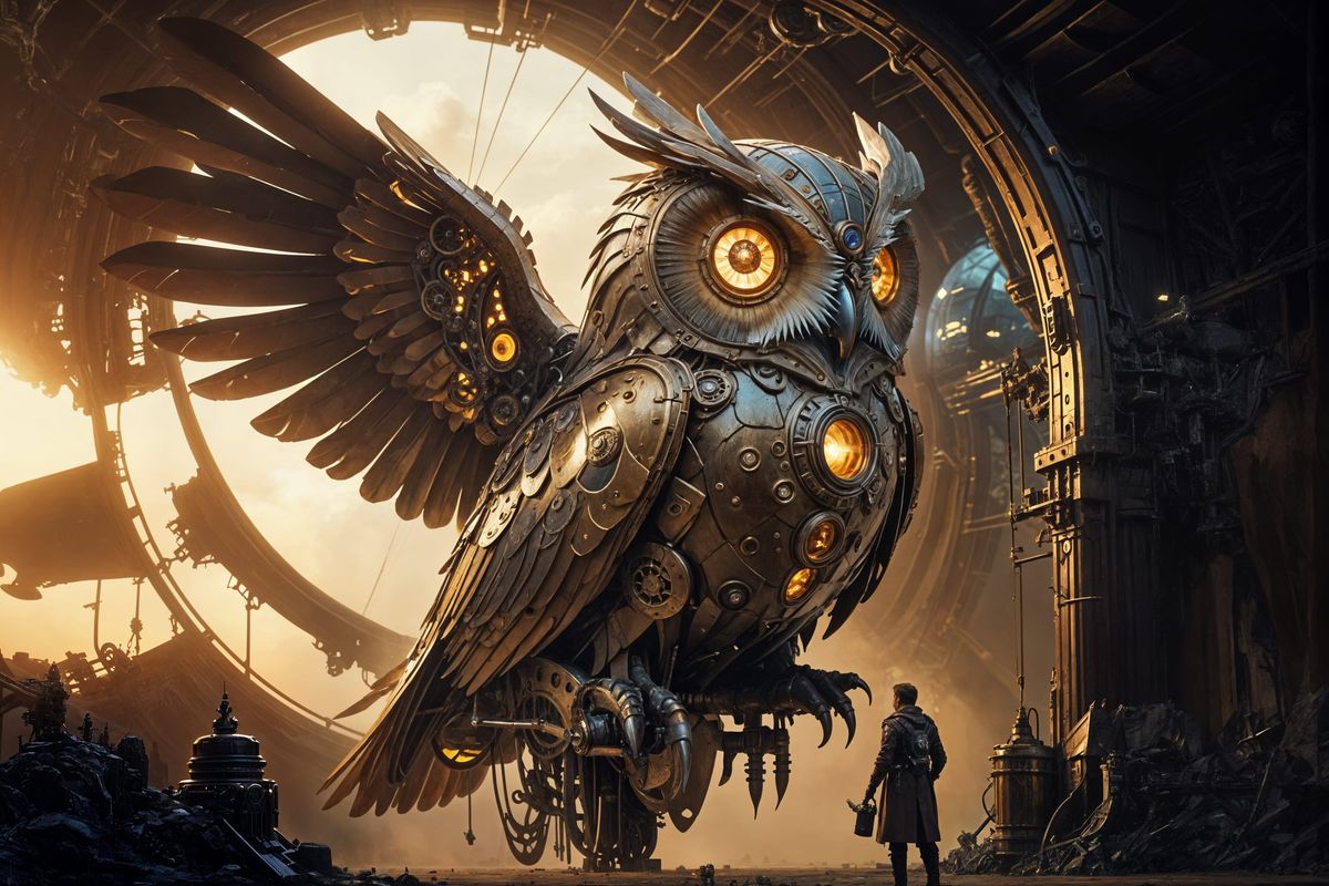 A striking picture of an owl-shaped airship piloted by an inventor. This steampunk-style digital painting features intricate mechanical details, polished metal, and a dramatic, atmospheric scene.