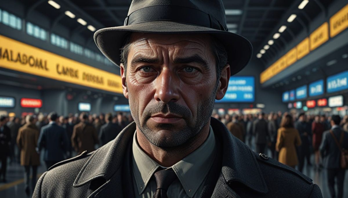 This image shows a close-up portrait in a film noir style. The vibrant digital painting features sharp details, dramatic lighting, and ethereal, deep colors with hyper-realistic 3D shading.