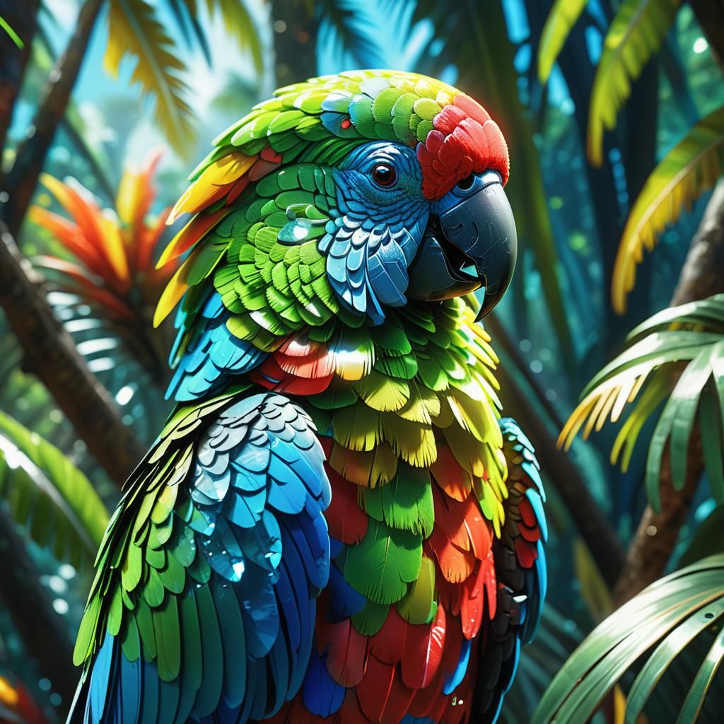 A vibrant portrait of a parrot's head and shoulders in a tropical setting with coconut trees and a rainbow. The image features soft feather details and dynamic lighting in a triadic color scheme.