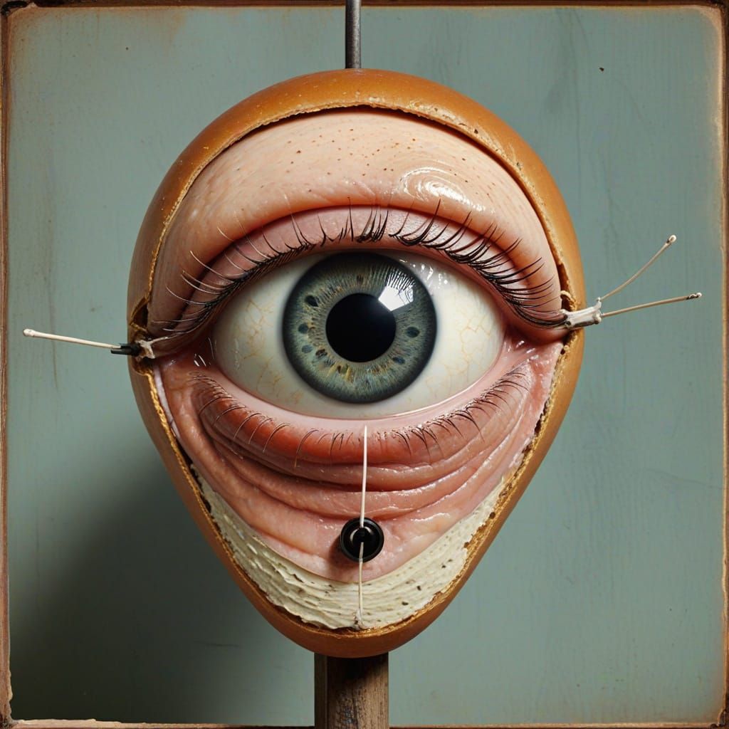 This image features a sausage adorned with numerous eyeballs, presented in a bizarre and disturbing collage style reminiscent of Dada and surrealism.