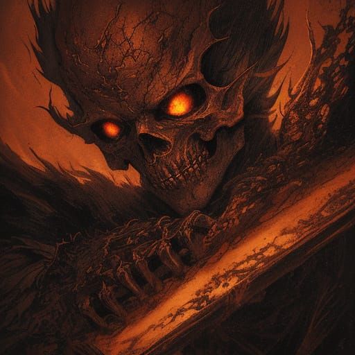 A striking picture of a skeletal hand holding a burning ember. The artwork features heavy cross-hatching and jagged ink strokes, rendered in dark, muted tones with crimson splashes, in a Rembrandt-inspired style.
