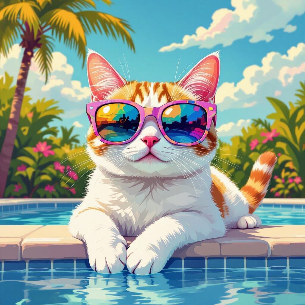 This image shows a cat wearing sunglasses, relaxing by a pool. The artwork features bold lines and vibrant pastel colors in a playful, futuristic comic style.