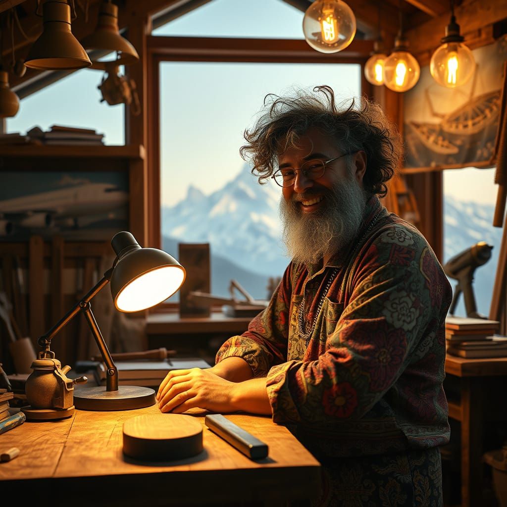 This image captures a young man with unruly silver hair, working in a cozy, modern workshop, surrounded by vibrant colors and intricate patterns, with a breathtaking snow-capped landscape in the background, infused with a sense of wonder and mystique, reminiscent of Syd Mead's and H.R. Giger's works