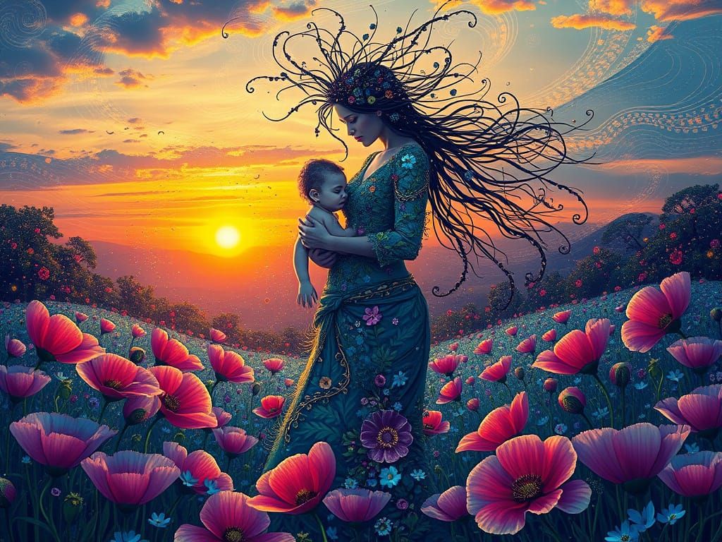 This enchanting image depicts a mother surrounded by iridescent creatures, tree-blossoming hair, and a stardust child, set amidst a kaleidoscopic sunset and intricate patterns, blending surrealism and vibrant photorealism.