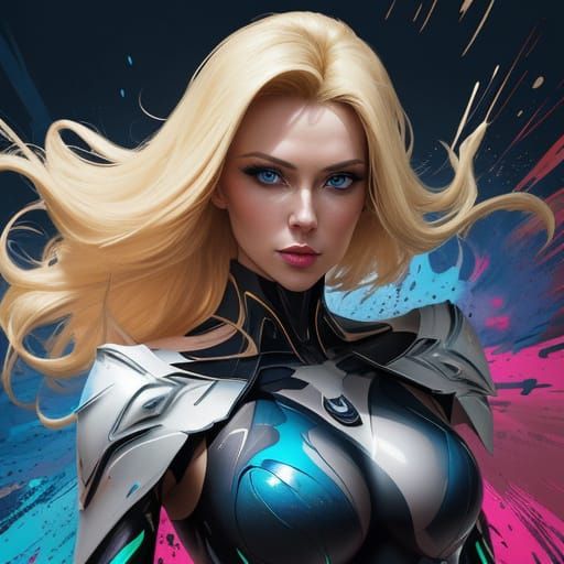 This image depicts a hyperrealistic blonde pin-up woman with bold eye contact, presented in splash art style with visible impressionistic brushstrokes and vibrant colors.