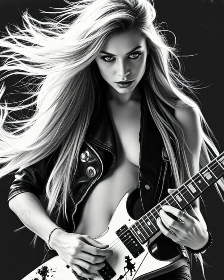 This image shows a blonde woman with long hair playing a guitar. The photo is monochromatic with an 80s vintage metal collage aesthetic, featuring a grainy texture and provocative pose.