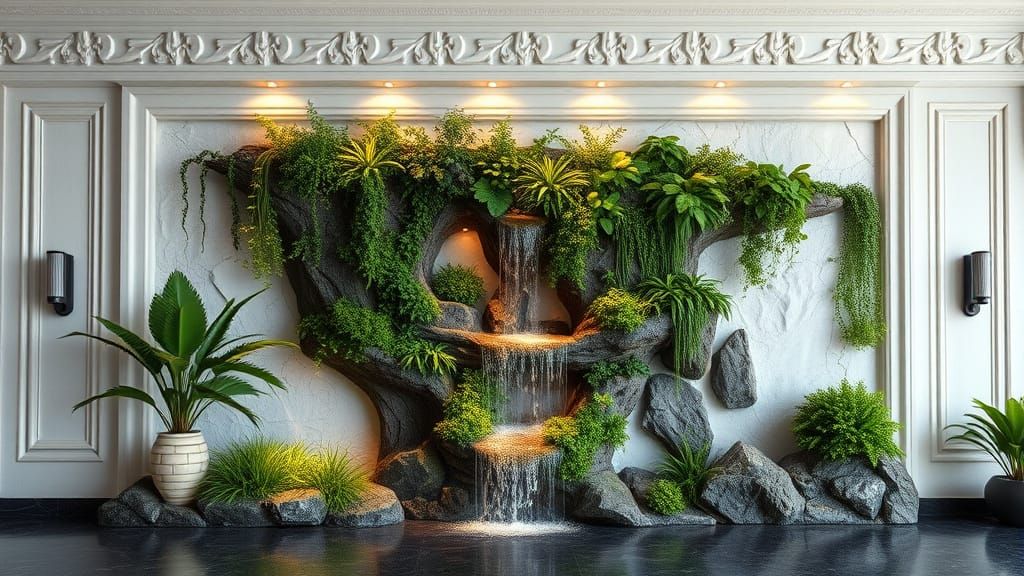 A captivating plaster frieze wall art piece featuring a living wall sculpture with a cascading waterfall. The symmetrical composition and fine art details evoke natural lighting.