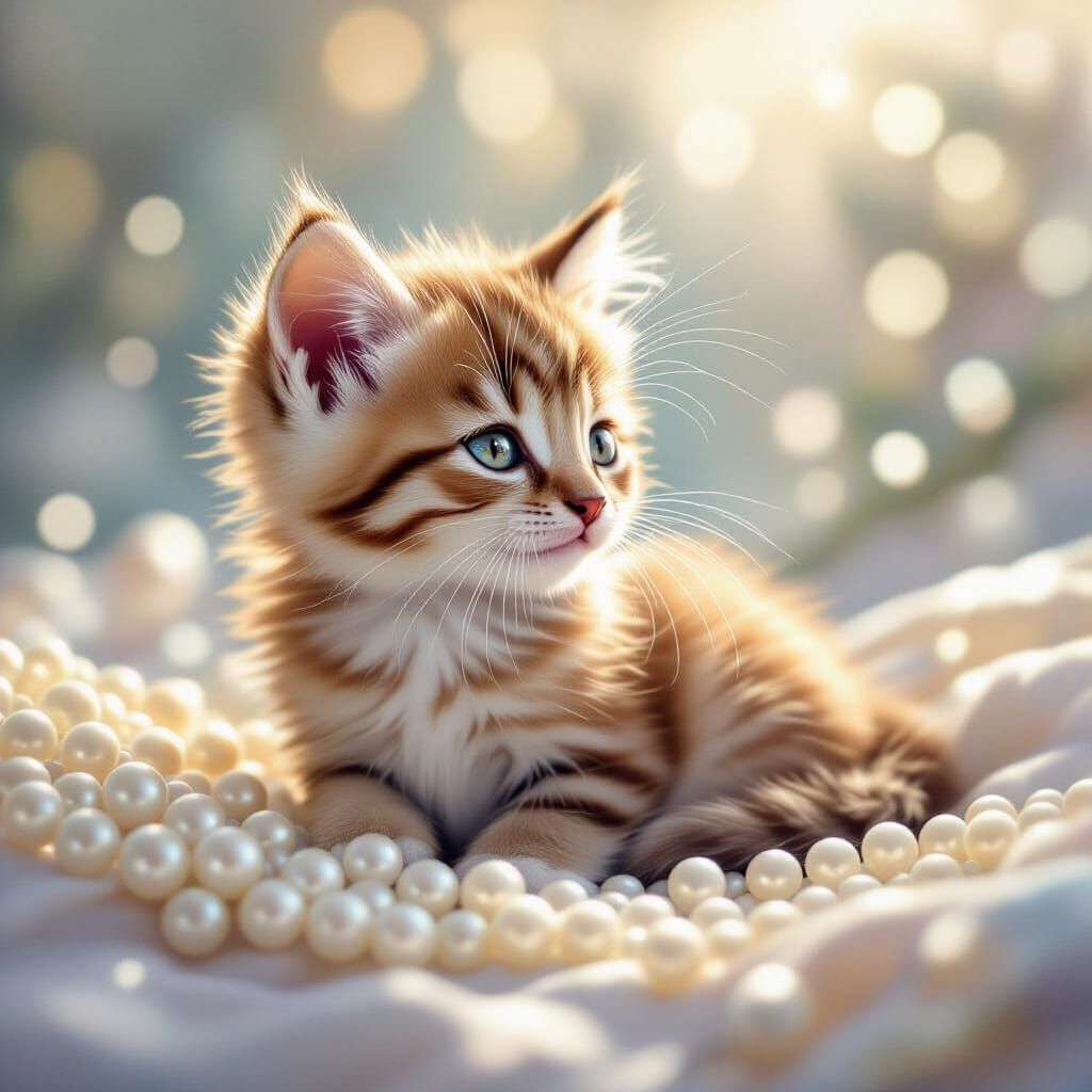 A softly lit image of a kitten nestled among dewy pearls. The scene is rendered in delicate pastel watercolor, creating a dreamy, high-resolution aesthetic with intricate details.
