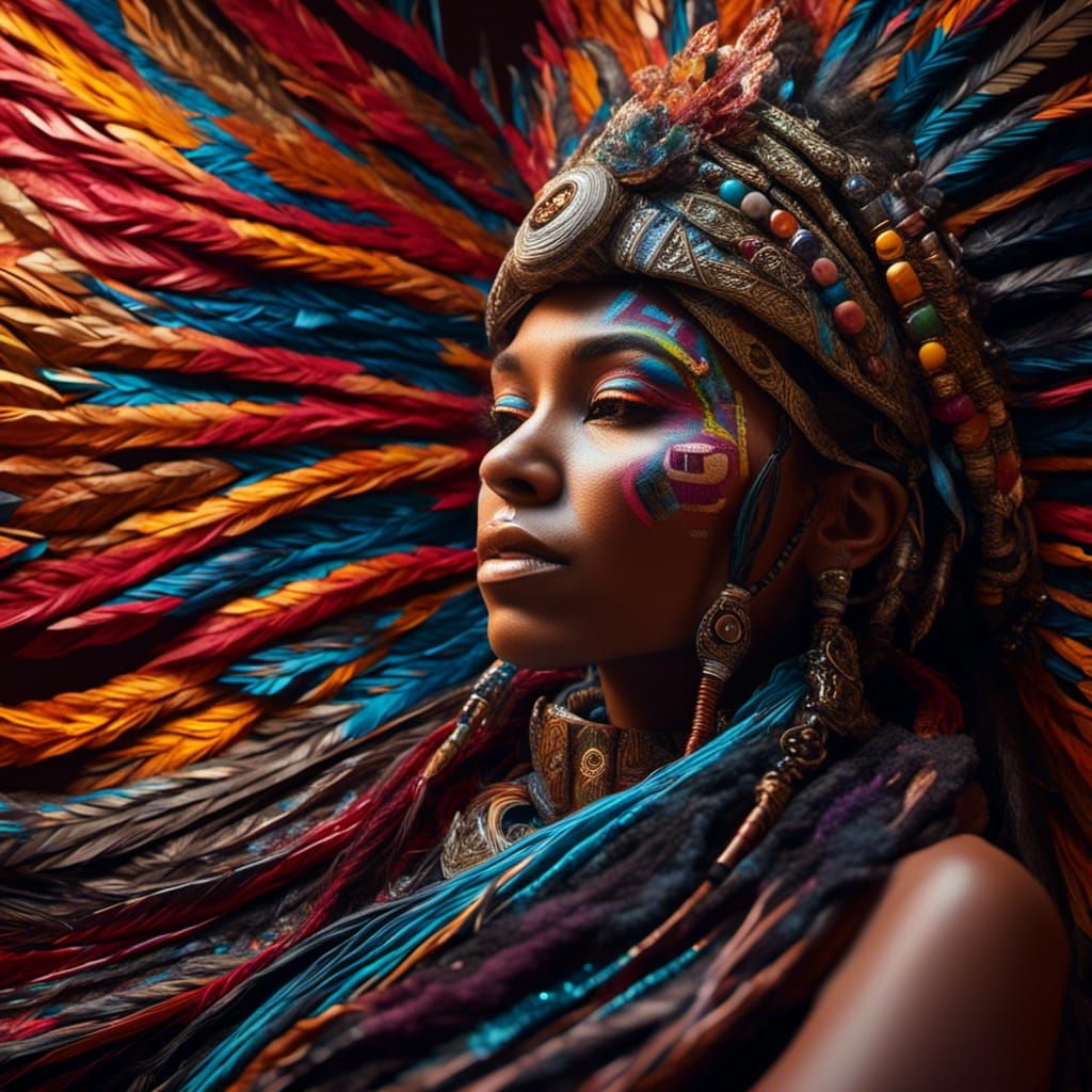 This image shows a detailed portrait of a tribal priestess. The artwork features woven strands of colorful leather stretched like tanned hide, rendered with bright studio lighting and rich color contrasts.