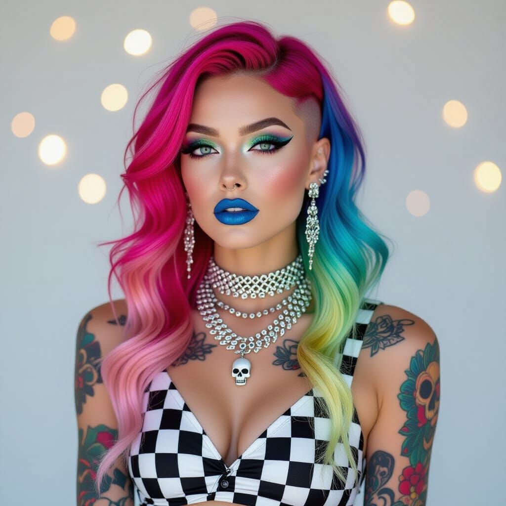 A captivating image of a young alternative model with rainbow hair and dramatic makeup. She's adorned with statement jewelry and tattoos, posing in a studio with a soft bokeh background in a detailed fashion photography style.