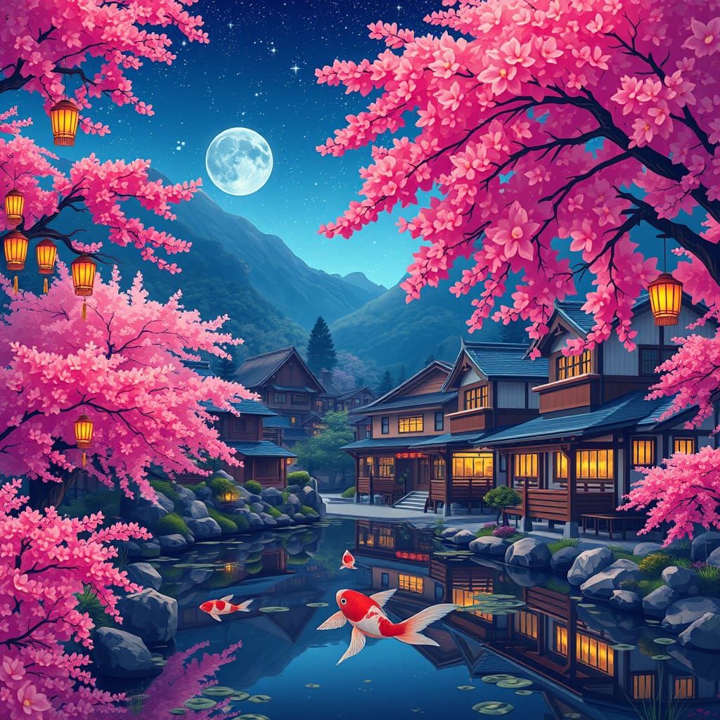 Easily generate your own peaceful village images with our free AI image generator, featuring cherry blossom trees and traditional Japanese settings.