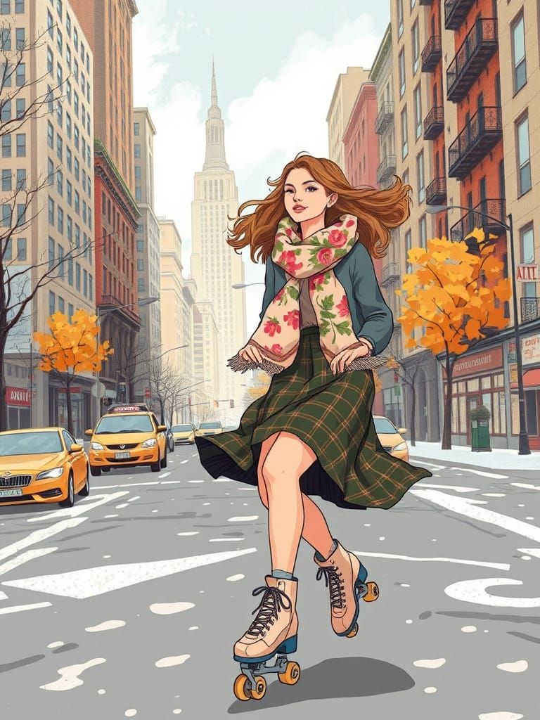 This image shows a young woman roller skating through a city, featuring a blend of all four seasons. The illustration style is reminiscent of classic romanticized art, with cinematic lighting.