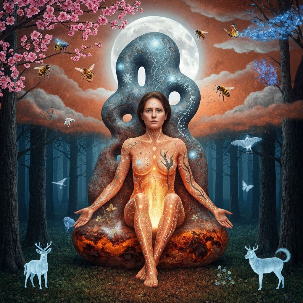 This image depicts a 1970s female sculptor within her large, surreal bio-art sculpture. It symbolizes resilience and transformation with ethereal lighting and vivid colors.