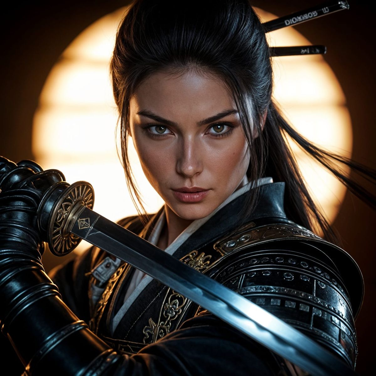 This hyperrealistic image showcases a beautifully dangerous woman holding a detailed sword, captured with incredible detail and realism.