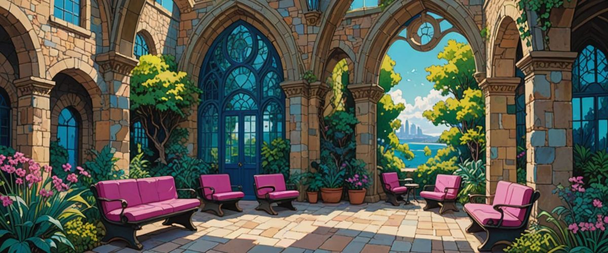 This image shows a futuristic arcology featuring benches and a trolly, rendered in a comic book style with vibrant indigo, magenta, and green hues. The composition includes M.C. Escher-inspired architecture.