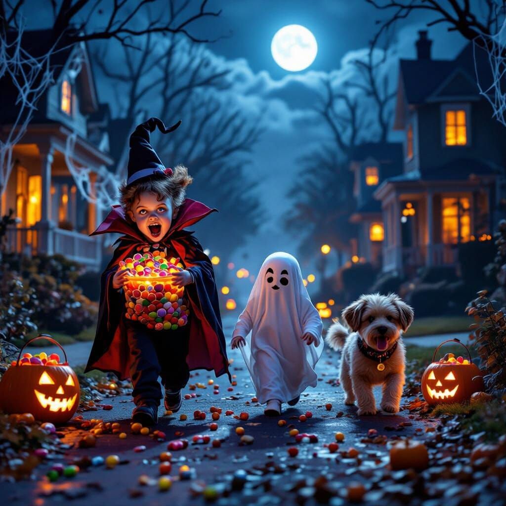 This image depicts a humorous and realistic Halloween night in a suburban neighborhood. Children in funny costumes, haunted houses, and glowing pumpkins create a mischievous atmosphere with cinematic lighting.
