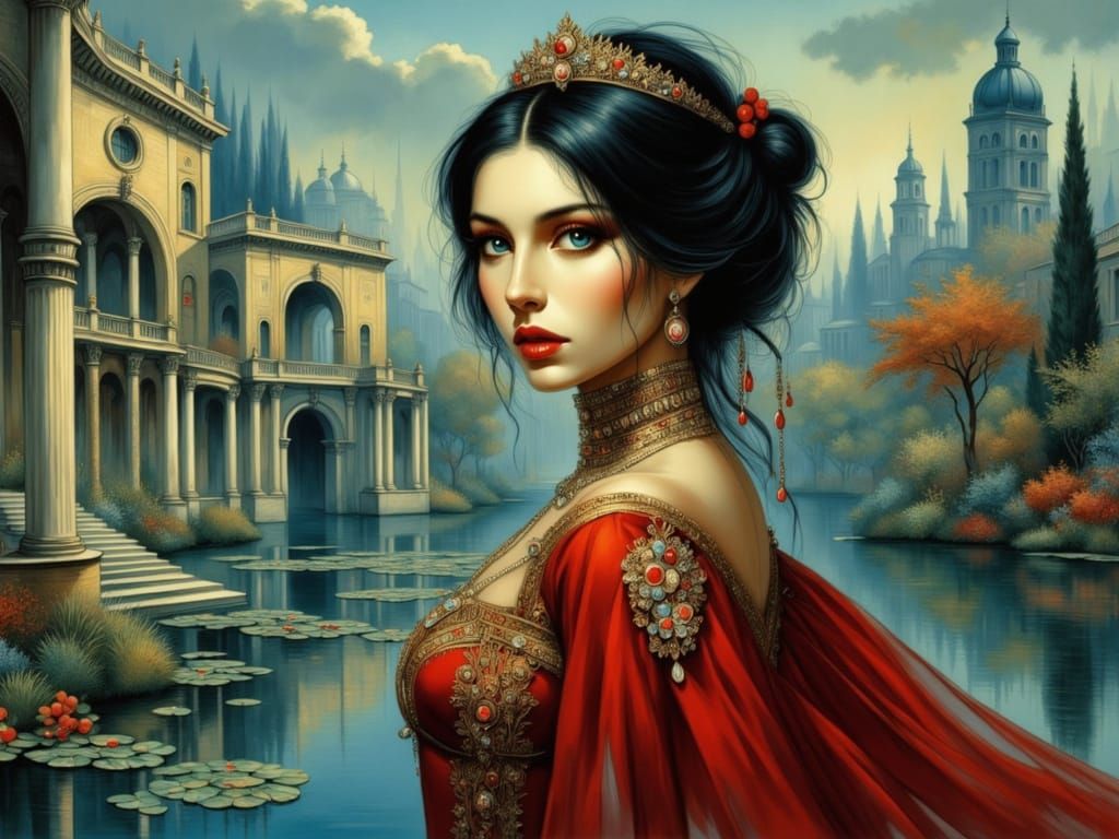 This image depicts Czarina Catherine II in 18th-century attire beside an android princess in a neon-lit park. A fusion of historical grandeur and futuristic design.