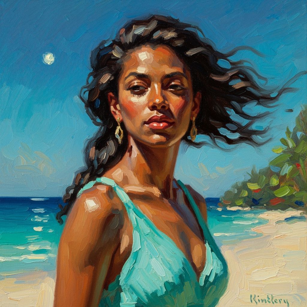 A painterly oil portrait of a dark-skinned woman on a tropical beach at night. Her hair blows in the breeze, captured with thick, textured impasto brushstrokes in a retro, Impressionistic style.