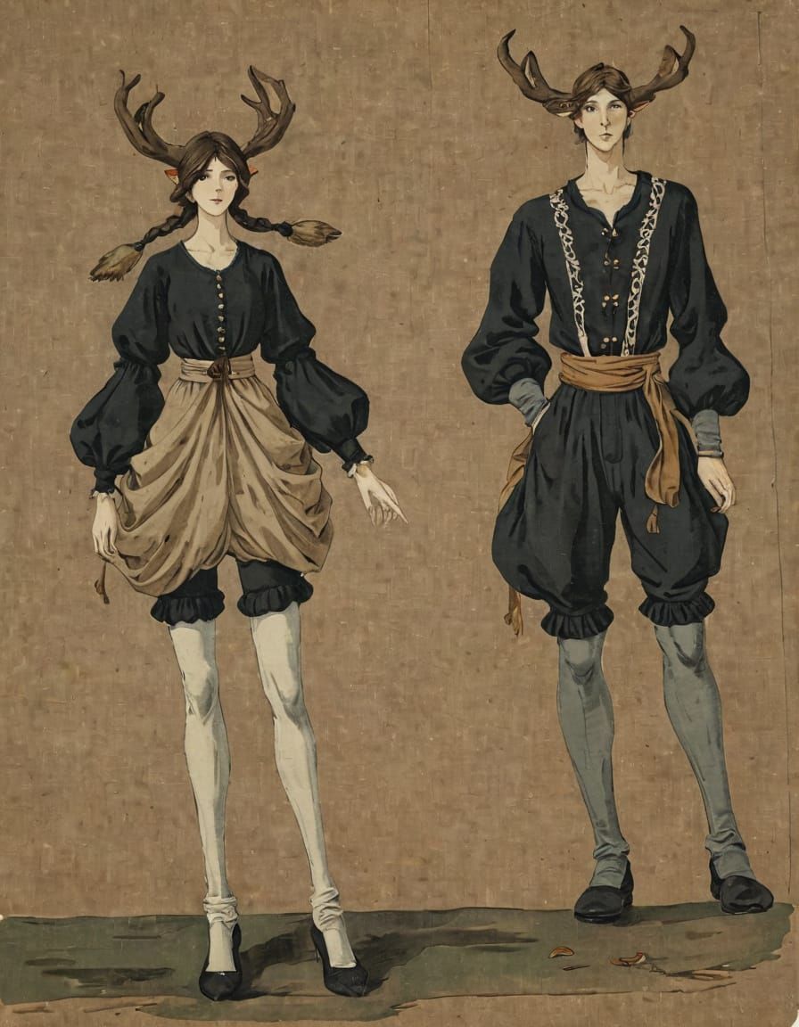 This image depicts two children, a girl and a boy, dressed in traditional clothing from a fantasy or medieval-inspired setting. The girl wears draped pants, while the boy is clad in breeches and a fur-lined bib. Both children have unusual headpieces resembling maple seeds, adding a touch of whimsy to the...