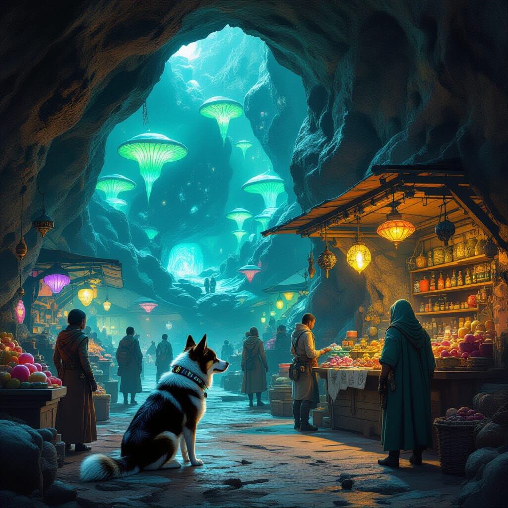 This image shows a vibrant alien marketplace inside a hollow asteroid, lit by glowing fungi. A Thai Ridgeback dog with a translator collar investigates a fruit stall. The scene is rendered as a detailed matte painting.