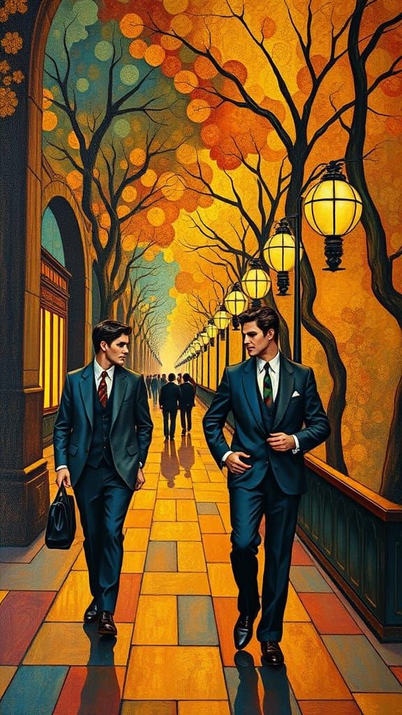 Men Promenade Down the Boulevard Gustav Klimt complementary colors deep color art Nouveau detailed painting oil on canvas filigree quilling brocade majolica 3D shading shadow depth beautiful elegant golden ratio iridescent intricate magnificent beautiful detailed painting Male Men