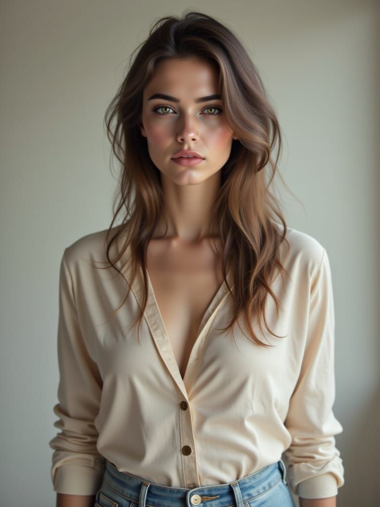 A highly detailed, photorealistic portrait of a young woman in a softly lit studio. Captured with a Canon EOS R5, this image features ultra-realistic skin, sharp focus, and cinematic lighting.