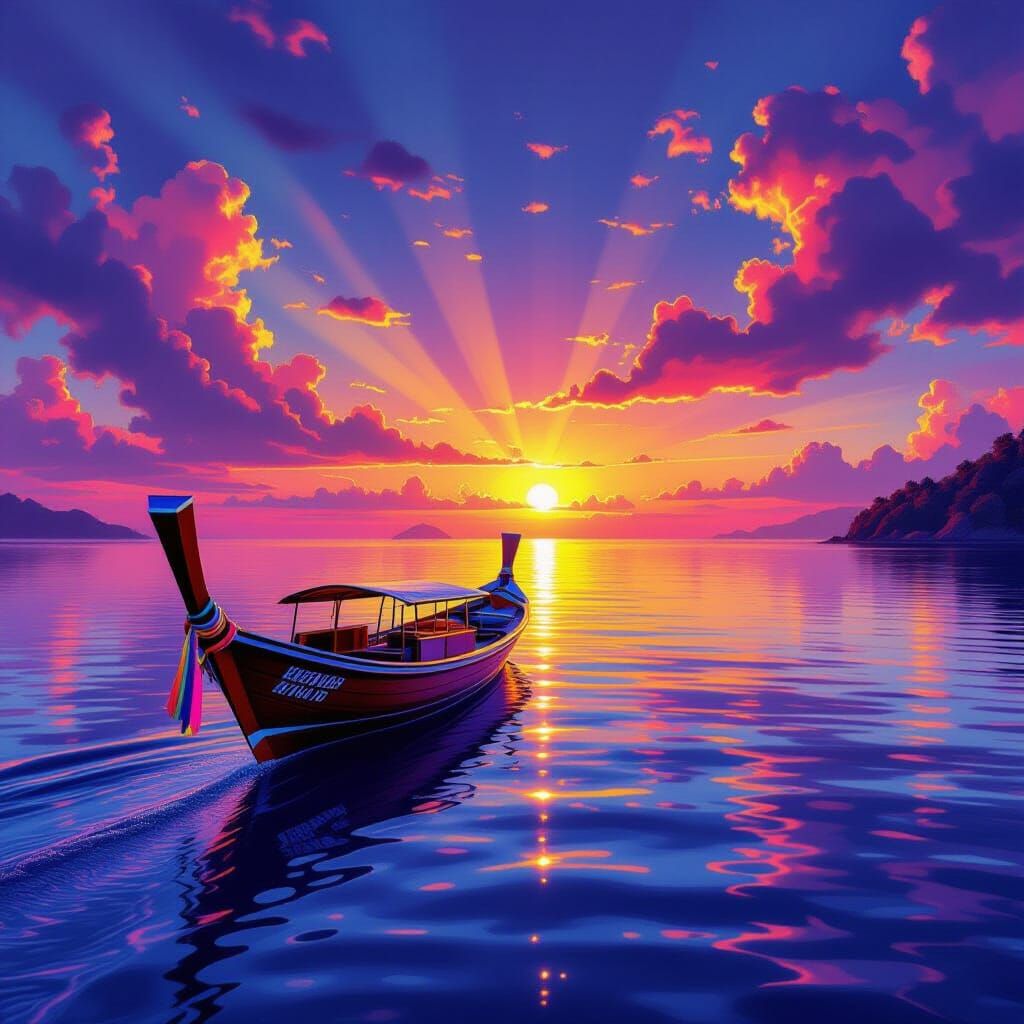 This image shows a vibrant, fantasy art depiction of a Thailand island at sunset. The scene features a longtail boat in a low-angle, perfectly composed view with bright, vivid colors and glowing, ethereal elements.