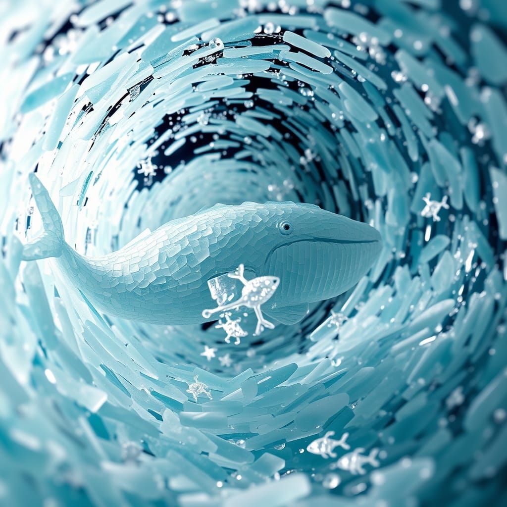 This hyperrealistic image depicts a majestic whale sculpture made of frosted sea glass in pastel blues and greens, swimming through a swirling ocean vortex. Clear glass sea creatures surround it.