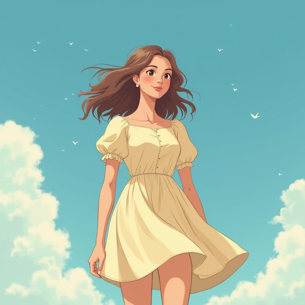 A confident young woman with pink hair stands under a blue sky. This image showcases flowing lines and natural light, reminiscent of art nouveau and anime styles.
