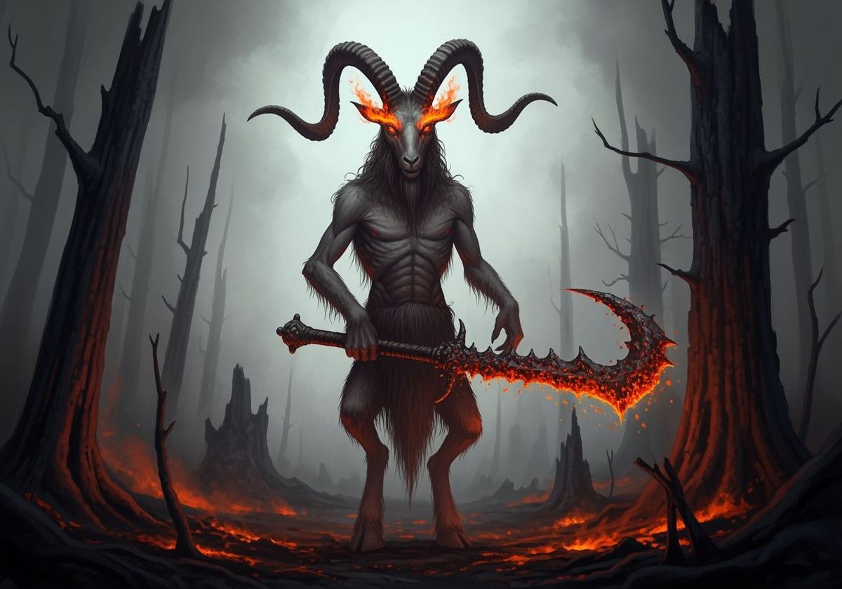 A dark fantasy image of a bipedal goat monster wielding a fiery blade, set in a desolate, ash-filled forest. The scene evokes a biomechanical, post-apocalyptic aesthetic.