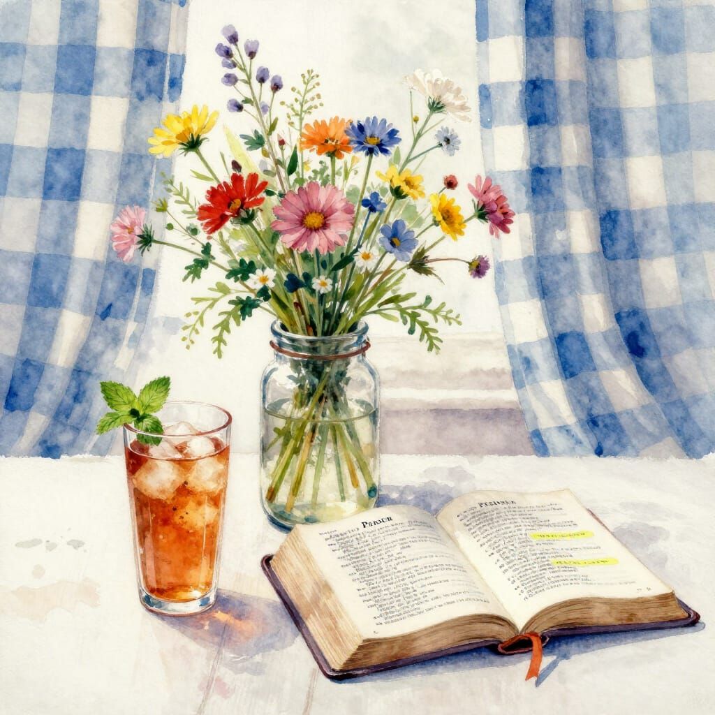 This image is a watercolor painting of wildflowers in a jelly jar, iced tea, and an open Bible with Psalms. It features loose brushstrokes and bleeding colors, bathed in soft, diffused light.