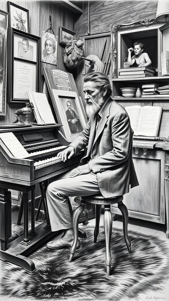 Paul Gauguin playing the harmonium in Alfons Mucha's studio at rue de la Grande-Chaumière, Paris. image shows Paul Gauguin playing the harmonium in his studio in Paris, around 1893-1894. The photograph was taken by his friend Alphonse Mucha. Gauguin is seated on a stool, with a fur rug on the floor. He ...