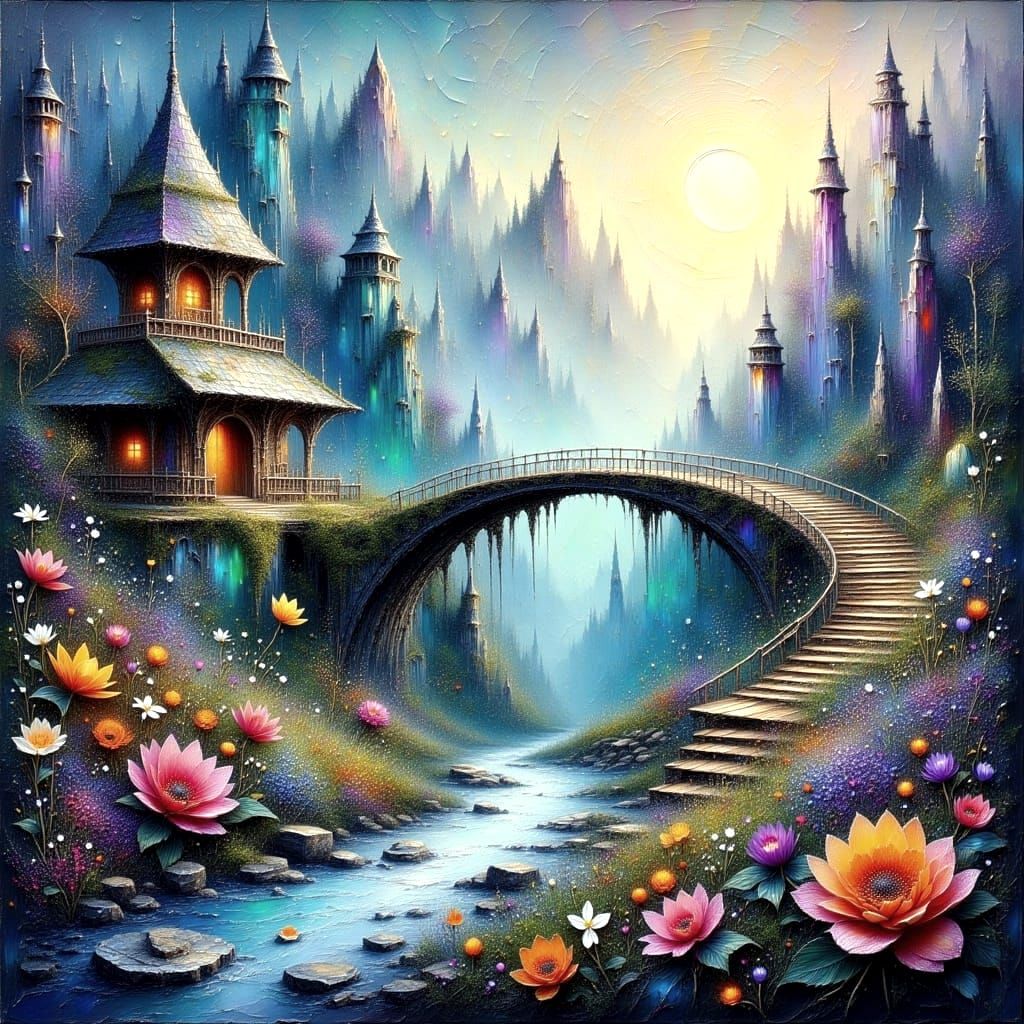 A painting of a serene misty valley with a shining river, featuring an Agarthan Light temple with crystals, surrounded by wildflowers and set against a backdrop of spectacular mountainsides and a bokeh moonlit sky.