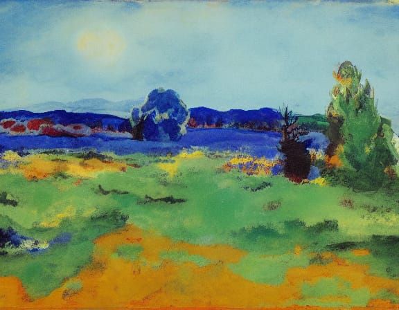 This image is a representation of a Primitivist Expressionist art piece, characterized by bold brushstrokes and earthy tones, inspired by the works of Emil Nolde, Eugen Chisnicean, and John Piper.