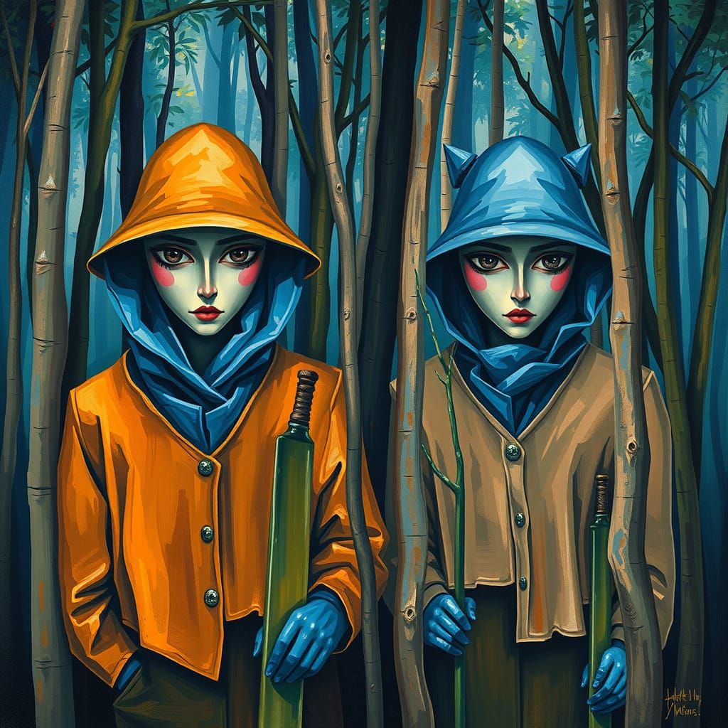 This image blends surrealist and cubist elements, featuring dreamlike messengers in contrasting blue and earthy tones, amidst a dense forest backdrop, with bold brushstrokes and vibrant colors, reminiscent of the works of Salvador Dali, Pablo Picasso, and Juan Gris.