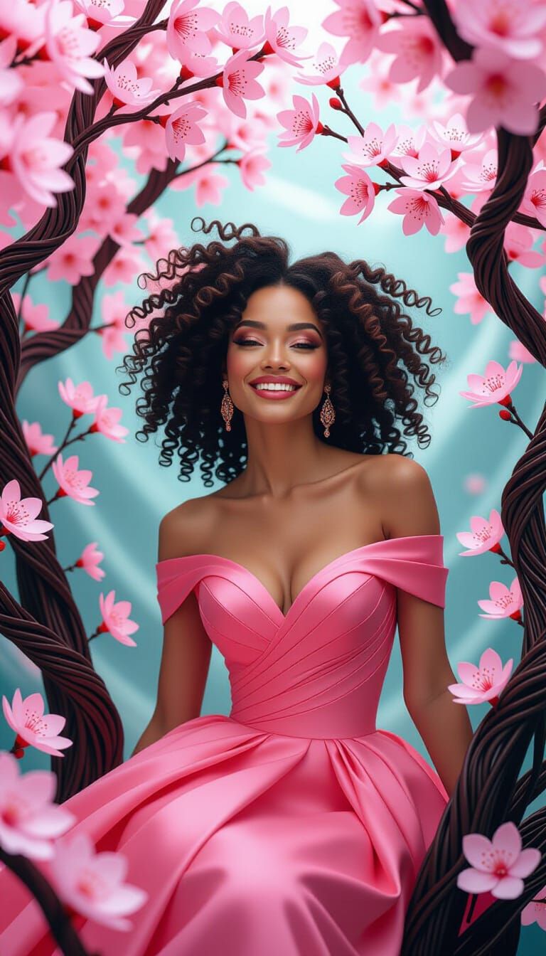 A digital rendering of a woman in a pink gown surrounded by cherry blossom trees. The artwork features surreal and futuristic elements, with vibrant colors and intricate details.