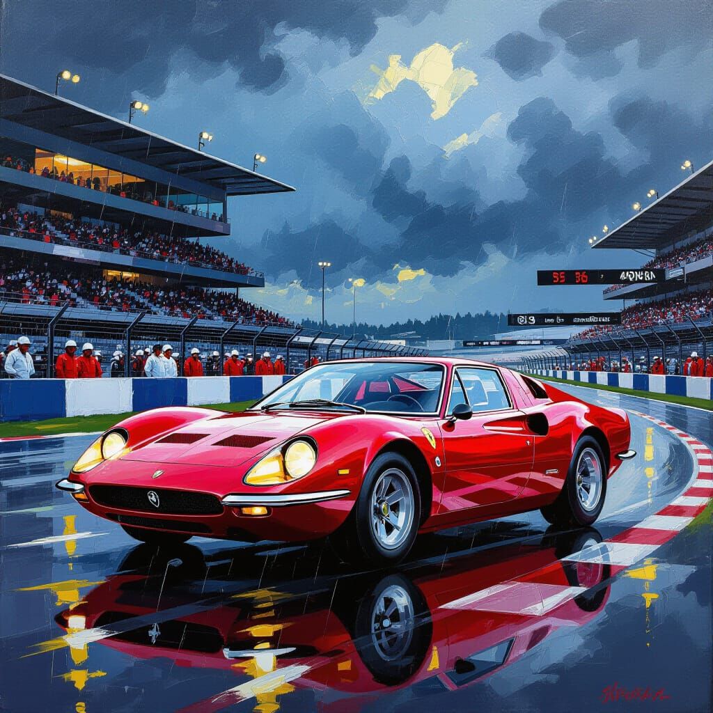 This image shows a metallic Ruby Red car, inspired by 1960s Lancia designs, in a rainy pit paddock at Nürburgring. Rendered as an impasto acrylic painting with bold textures and warm hues.