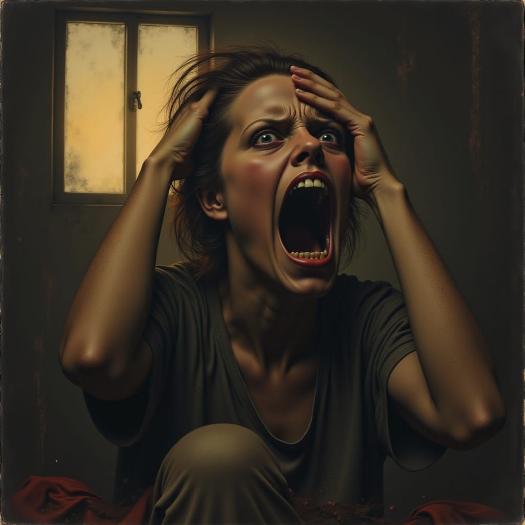 This image shows a distressed 45-year-old woman screaming with her head in her hands, conveying intense stress and sadness. Rendered in a dramatic, expressionistic painting style with bold brushstrokes and somber colors.