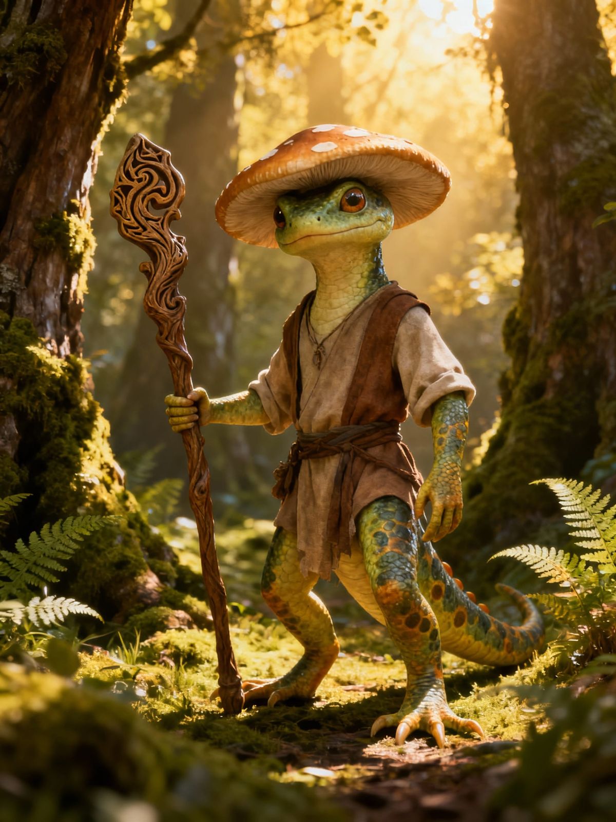 This digital fantasy art depicts a full-body humanoid salamander in a forest. The creature wears clothes, a mushroom cap hat, and holds a magic staff, ideal for D&D.