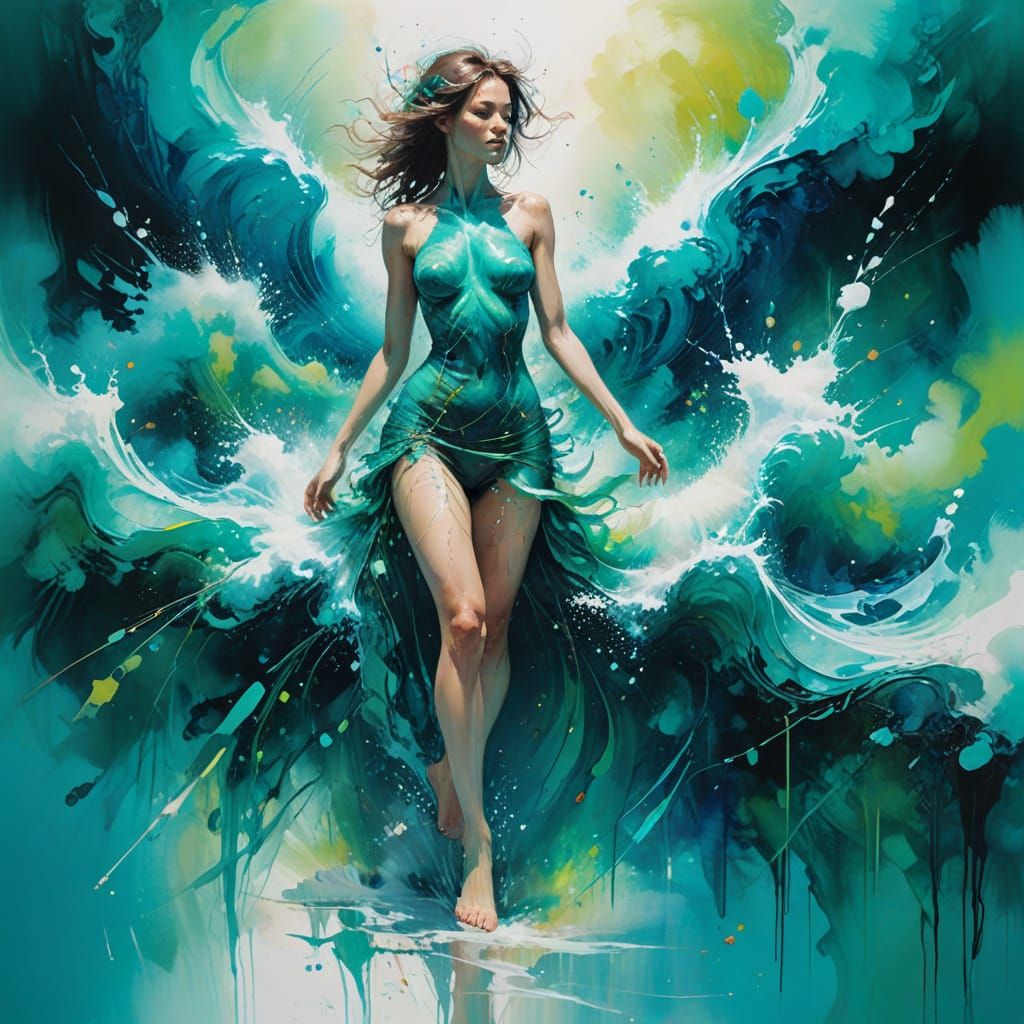 This image depicts a dynamic abstract landscape filled with fluid shapes and glowing turquoise energy. It features vibrant neon waves and crystalline facets, created with bold digital brushstrokes and watercolour techniques.