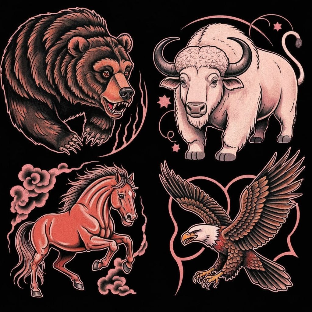 This image shows a flash tattoo sheet with Native American spirit animals. A dynamic collection of a bear, white buffalo, mountain lion, stallion, and eagle are rendered in bold, vibrant colors.