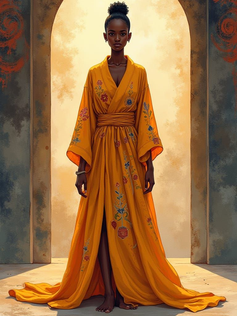 A watercolor and ink illustration of a Black female artist on a stage, framed by golden light. She wears an ochre robe with embroidered symbols, set against a textured backdrop.