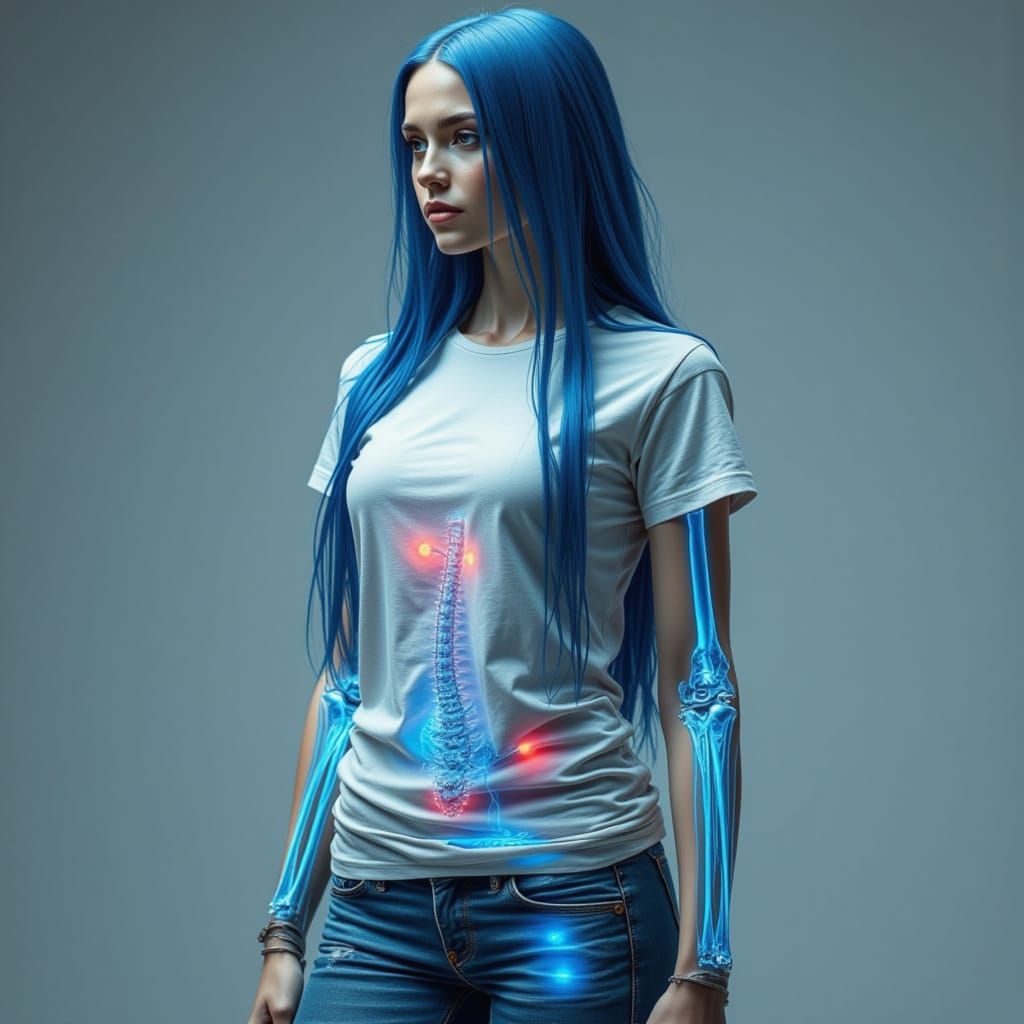 This image depicts a woman with long blue hair and a white t-shirt. The image shows an x-ray view of her bones, set in a bio-punk aesthetic.