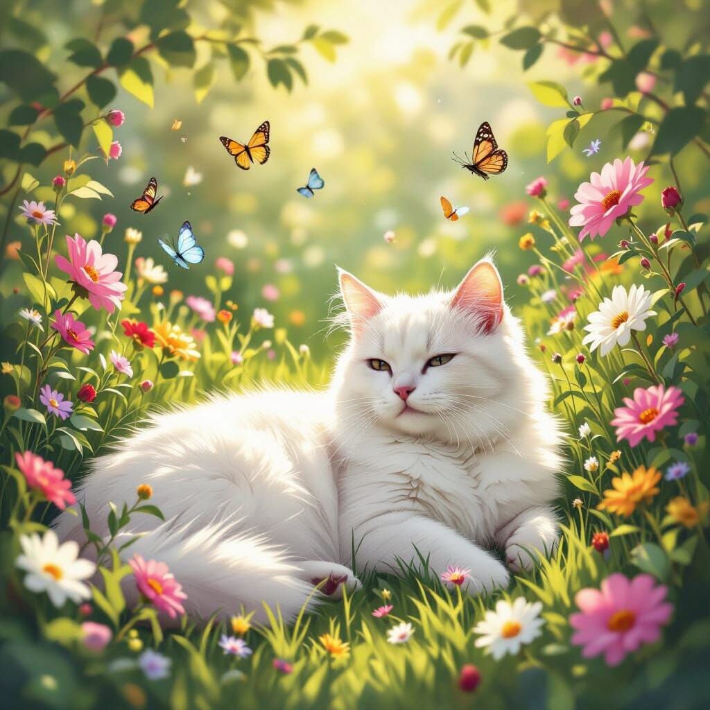 This image shows a white British shorthair cat relaxing in a sun-drenched garden abuzz with butterflies. The scene evokes impressionistic watercolor art with whimsical and dreamy qualities.